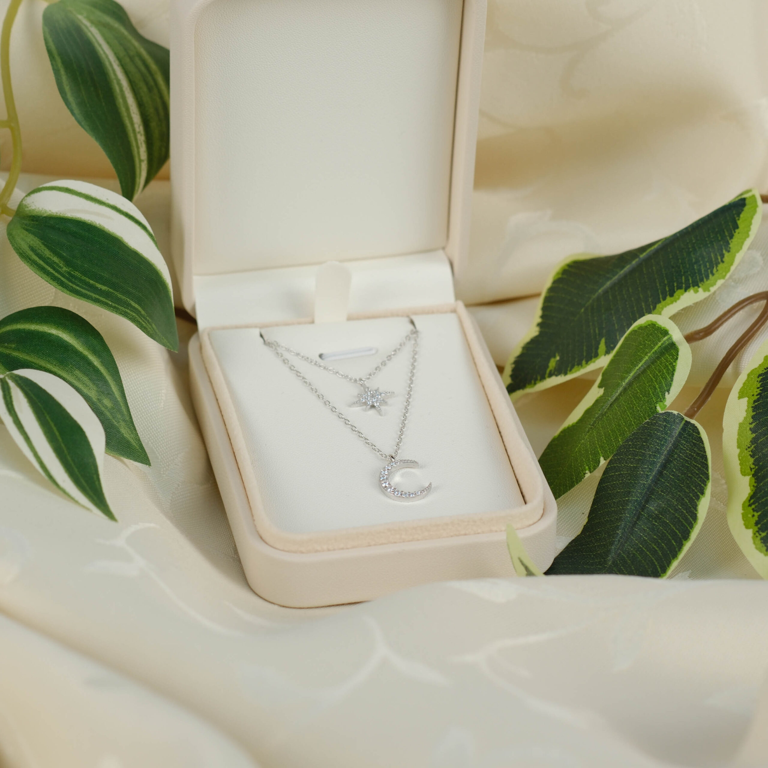 Celeste Duo er en elegant halskæde i 925 sterlingsølv, designet med to fine vedhæng: en funklende stjerne og en smuk halvmåne, begge indfattet med klare zirkonia-sten. Designet er inspireret af nattehimlen og symboliserer drømme, guidning og balance.